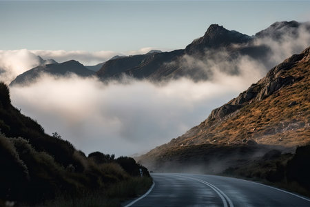 dramatic mountain range, with clouds hovering above and fog drifting below, seen from the road, created with generative ai