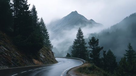 Winding asphalt road navigating through pine trees and fog, ascending towards a mountain peak. Winding mountain road leading to a foggy Alps peak