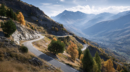 Driving through a scenic mountain road, surrounded by towering peaks and lush forest in autumn. Generative AI