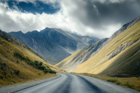 A captivating view of a winding road nestled in the mountains, surrounded by breathtaking landscapes and dramatic lighting, perfect for nature lovers and travelers.
