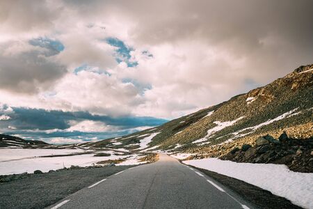 Road trip to Norway, driving on highway along beautiful high snowy mountains, traveling to Europe, freedom and adventure concept..