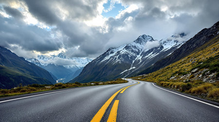 Asphalt road stretching towards snow-covered peaks and cloudy skies, perfect for car travel inspiration.