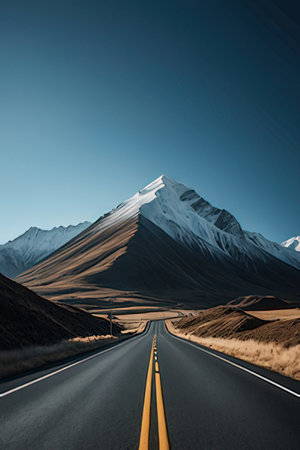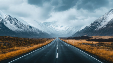 Straight highway leading into the snowy mountains with a cloudy sky, showcasing the beauty of nature.