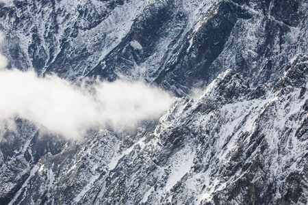 Aerial view of snow covered mountains. Winter landscape. Top view.