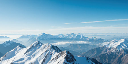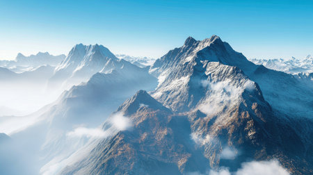 Top view of a majestic mountain range with snow-capped peaks, surrounded by layers of mist and a deep valley below, under a clear blue sky.