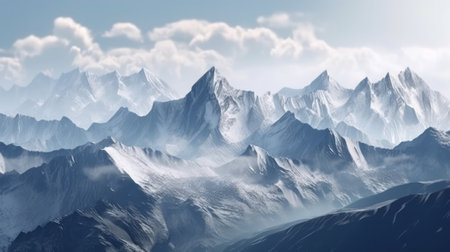 majestic mountain range shrouded in misty clouds, with snow-capped peaks visible, created with generative ai