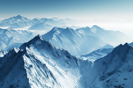 A stunning view of snow-covered mountains enveloped in a gentle mist, creating a serene atmosphere. Ideal for nature lovers and adventure enthusiasts seeking inspiration.