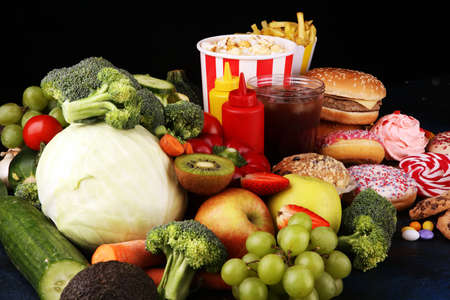 healthy or unhealthy food. Concept photo of healthy and unhealthy food. Fruits and vegetables vs donuts,sweets and burgers on table