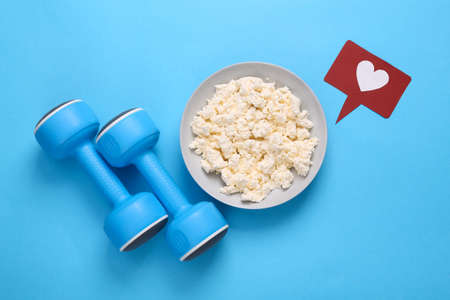Healthy lifestyle concept. Dumbbells with a plate of cottage cheese and a like icon on a blue background. Fitness blog