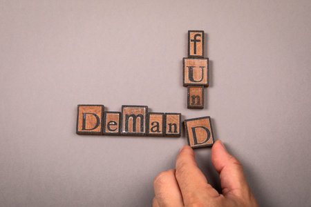wooden blocks with letters DEMAND on the office desk, information and communication background, selective focus on office workplace
