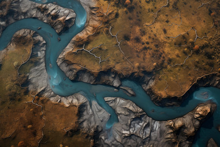 A stunning aerial view of a river flowing through a picturesque valley. This captivating image captures the beauty of nature and the serenity of the flowing water. Perfect for travel brochures, website backgrounds, and environmental publications.