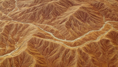 desert region in a mountainous landscape captured in an alien terrain wallpaper. this aerial-style photograph showcases a misty atmosphere with soft-focus portraits. the beige and amber tones create an otherworldly ambiance. shot with a sony fe 85mm f/1.4 gm lens on a nikon f2, these atmospheric shots transport viewers to a captivating and surreal environment. ai generated