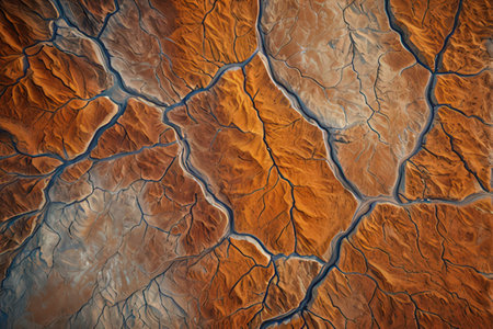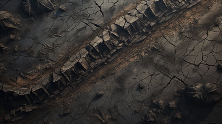 an earth texture with crack lines at the edges is depicted in this image. the gothic dark and moody tones create a cinematic atmosphere, while the aerial view showcases the post-apocalyptic landscapes. shot with the sony fe 12-24mm f/2.8 gm lens, the image captures hyper-realistic details and dusty piles. ai generated