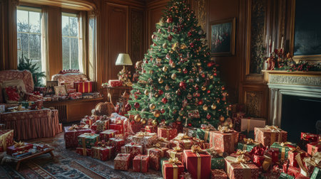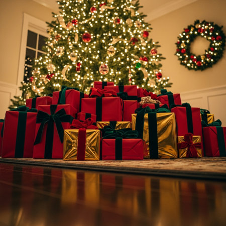 A traditional Christmas tree with vibrant red, green, and gold ornaments, surrounded by heaps of presents tied with ribbons, in a warmly lit home.
