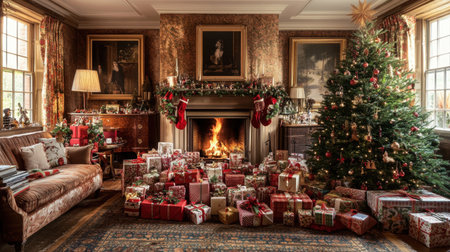 A festive living room with a roaring fireplace, a sparkling Christmas tree, and a mountain of beautifully wrapped gifts spread out beneath it.