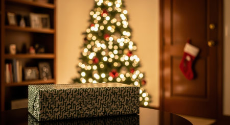 A beautifully wrapped gift sits in front of a brightly lit Christmas tree, creating a warm and inviting holiday atmosphere in a cozy home setting.