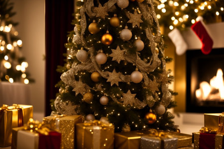 Christmas tree adorned with golden ornaments and sparkling lights, creating a warm and festive atmosphere for the holiday season. The image captures the magic and joy of christmas