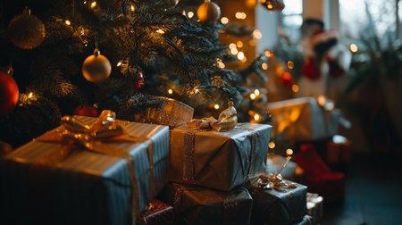 Amidst glowing lights and festive decorations, beautifully wrapped presents await excited hands on Christmas morning, creating an ambiance of joy and anticipation in a warm living room.