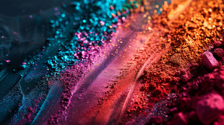 A captivating arrangement of vibrant powders in various colors spread on a dark surface, ideal for artistic projects and creative designs.