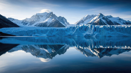 A landscape features a snow-capped mountain range, a large glacier, and a tranquil body of water. The scene is bathed in sunlight, with vibrant blue hues dominating. The composition emphasizes reflections, conveying a sense of serenity. Suitable for various projects, including editorial features, nature-related content, or travel-themed designs.