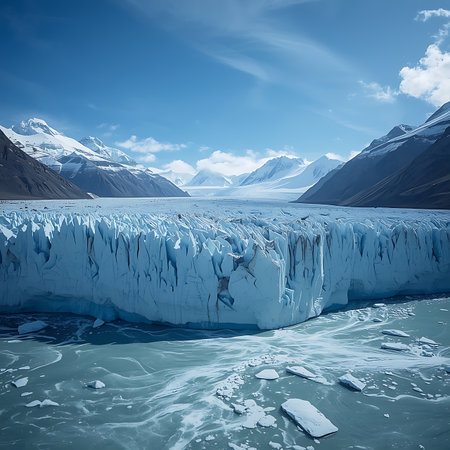 A breathtaking landscape of a massive glacier surrounded by snow-capped mountains and a serene lake