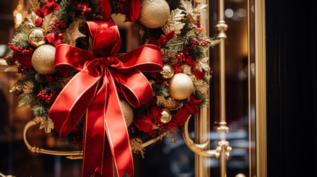 Christmas decoration details on English styled luxury high street city store door or shopping window display, holiday sale and shop decor inspiration