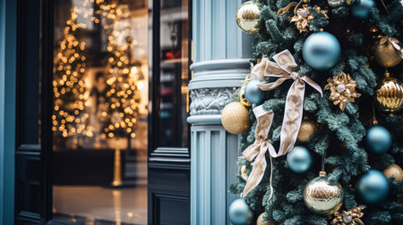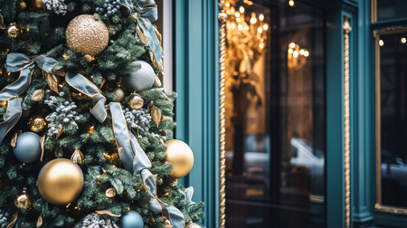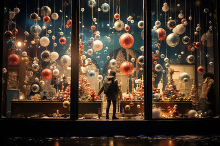 Beautiful decorations fill the display windows of a Christmas New Year shop, featuring shiny ornaments and festive lights that capture the holiday spirit in a bustling street.