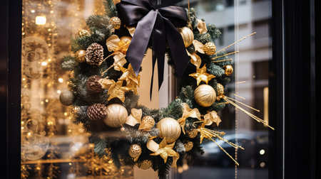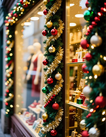 Festive decorations adorn the showcase shop featuring holiday garlands with red and gold ornaments. Colorful lights add to the joyful Christmas and New Year spirit.