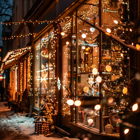 A festive shop display features sparkling lights and colorful decorations for Christmas and New Year. Ornaments and mini trees add holiday charm to the storefront scene.
