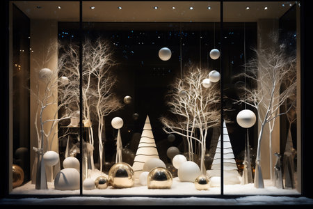 Shop Window with festive white Christmas decorations idea. AI Generative.