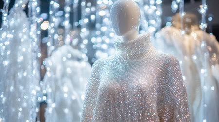 White sequin sweater displayed on a mannequin in a fashion retail store, with a backdrop of sparkling white lights, creating a festive winter atmosphere
