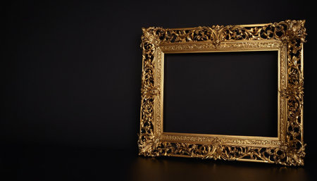 This ornate golden picture frame features intricate details and an elegant design, perfect for showcasing artwork or photography on a contrasting dark background.