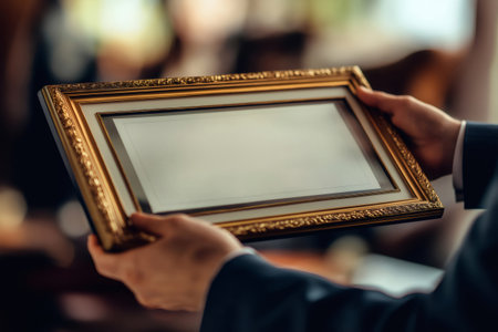 Close up of hands holding a framed certificate of achievement, celebrating success and professional recognition