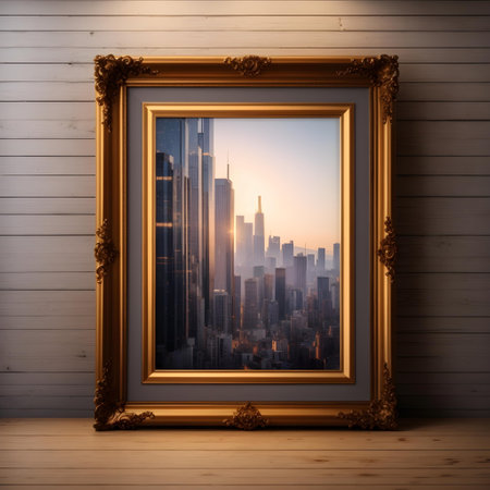 An AI generated illustration of a wooden frame against a wall with a painting of city buildings