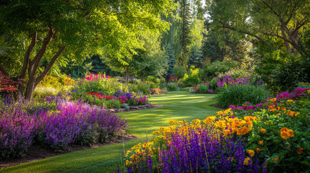 Vibrant garden blooms in soft morning light with an array of colorful flowers and lush greenery