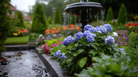A garden with a fountain and flowers. The flowers are blue and white. The garden is wet from the rain