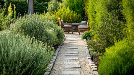 A rustic garden path lined with rosemary bushes, leading to a cozy outdoor seating area, creating a peaceful and inviting atmosphere.