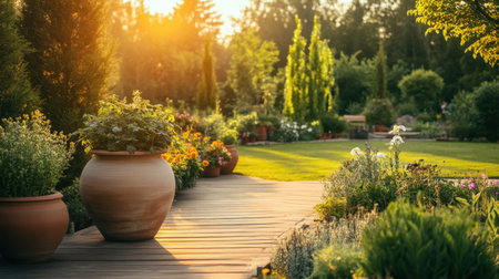 Beautiful garden pathway lined with vibrant flowers and plants, illuminated by warm glow of setting sun. scene evokes sense of tranquility and natural beauty, inviting visitors to explore