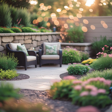 Beautiful Garden Patio Scene Summer Evening Relaxing Outdoor Dining Area home warm cozy lush table