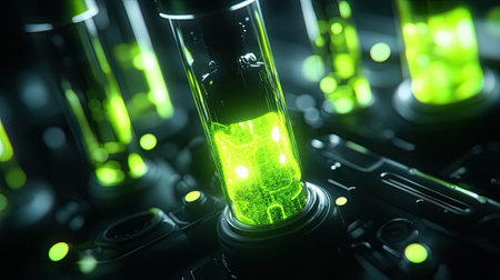 A captivating view of futuristic laboratory filled with glass vials containing glowing green liquid, highlighting advanced technology and scientific exploration.