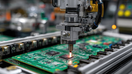 Close-up image showcasing a robotic arm engaged in the precision soldering process on a circuit board. This technology highlights efficiency and innovation in modern electronics manufacturing.