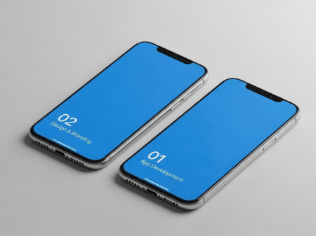 Two smartphones displaying blue screens, isolated on white background