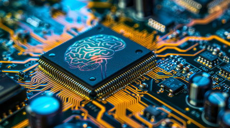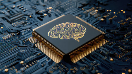 Close-up of a modern microchip displaying an intricate brain design on a circuit board background, symbolizing innovation in technology and artificial intelligence.