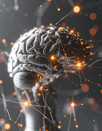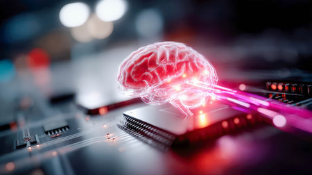 This captivating digital artwork features a brain with neural connections, set against a technology-inspired background. It symbolizes innovation and intelligence.