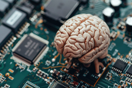 A model of the human brain sits atop a circuit board, suggesting the interconnectedness of technology and the human mind.