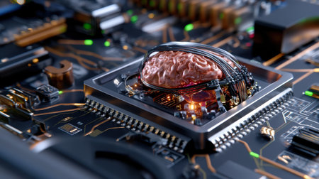 A computer chip with a brain on it. The brain is surrounded by wires and circuitry. Concept of technology and the human brain, and the mood is futuristic and advanced