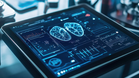 A sleek tablet exhibits intricate lung data and analytics in a clinical setting, highlighting the integration of technology and medicine for enhanced diagnostics and patient care.