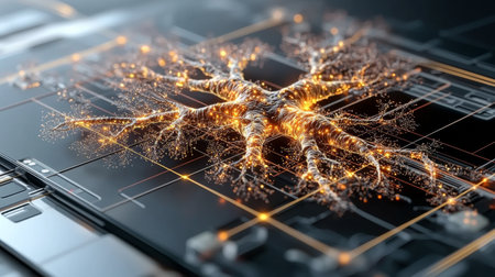 A stylized brain circuit overlaid on a circuit board, visually representing the concept of artificial intelligence or brain-computer interface.