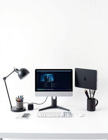 Modern workspace with computer, mouse, keyboard, lamp and stationery