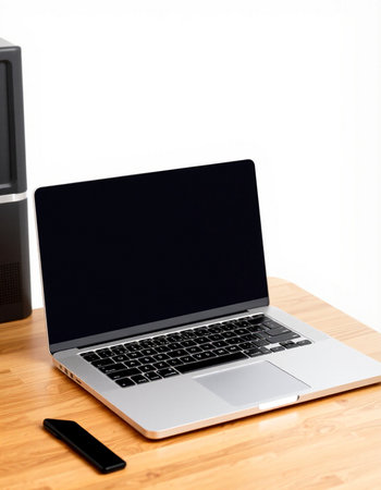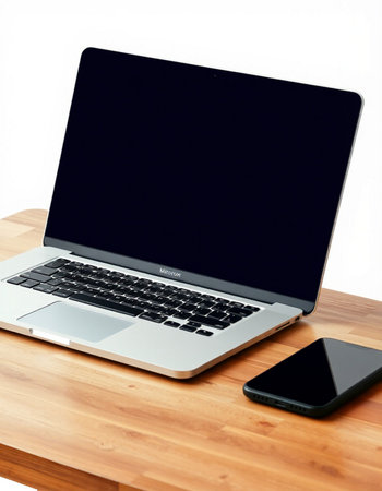 Laptop with blank screen on wooden desk with coffee cup and mouse